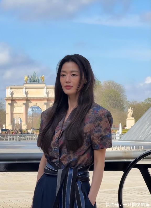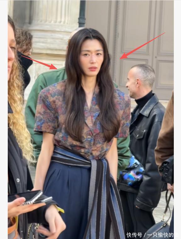 全智贤这次翻车就更让人觉得可惜了,不光是穿的衣服不行,连状态好像都跟着受影响,有点拖后腿。她当天穿了件老花图案的短袖衬衫,下面配了条深蓝色的阔腿裤,腰上还系了条宽宽的条纹流苏腰封,一层一层叠在那儿,看着特别臃肿,不利索,而且颜色也暗暗的,显得她皮肤都没那么亮了,有点暗沉。