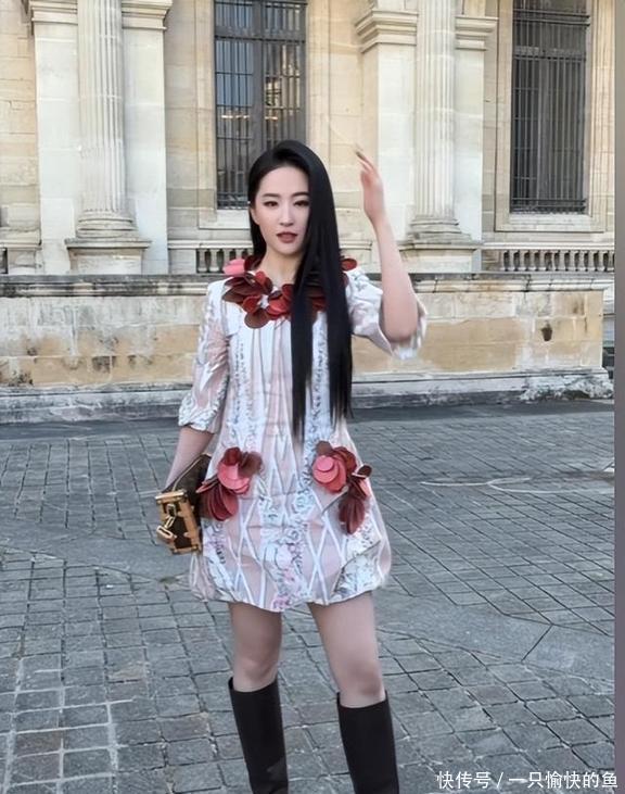 她当天准备了两套礼服,在外场穿的是粉白色的花苞裙,脚上踩了双棕色的靴子,本来想营造一种仙气飘飘的感觉,可那裙子设计得有点生硬,领口还有点花瓣的造型,看着特别局促,一点都不舒展。裙子的纹路和花瓣造型也不太搭,特别是上半身和下半身风格差太多了,再加上那双厚厚的黑色长靴,直接把腿给拉短了,好好的高挑身材,愣是给穿成了五五开,太不划算了。